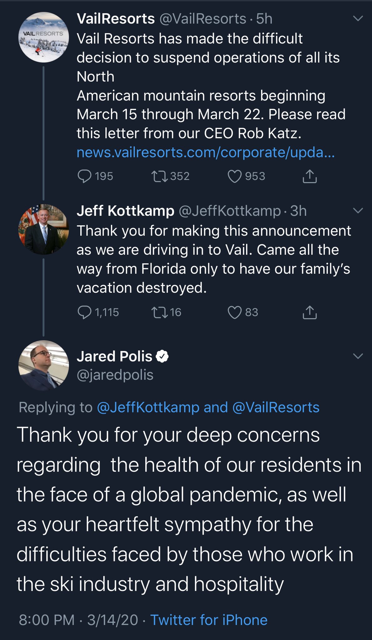 Brian Tyler Cohen On Twitter Hooooly Shit Kottkamp Republican Lt Gov Of Florida Is Complaining That His Vacation To Vail Was Disrupted By A Global Pandemic Polis The Democratic Gov Of Colorado